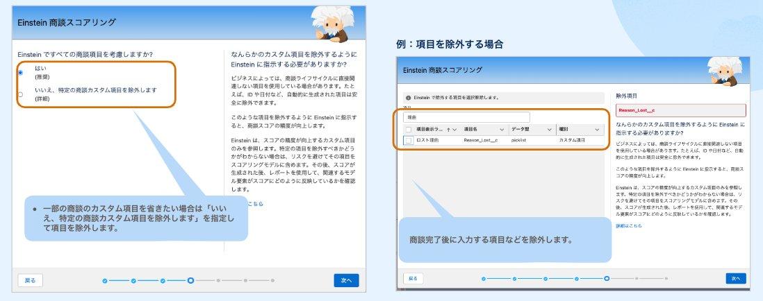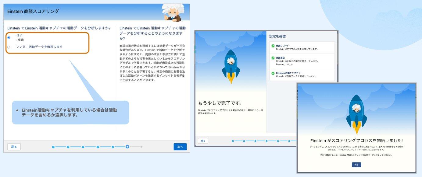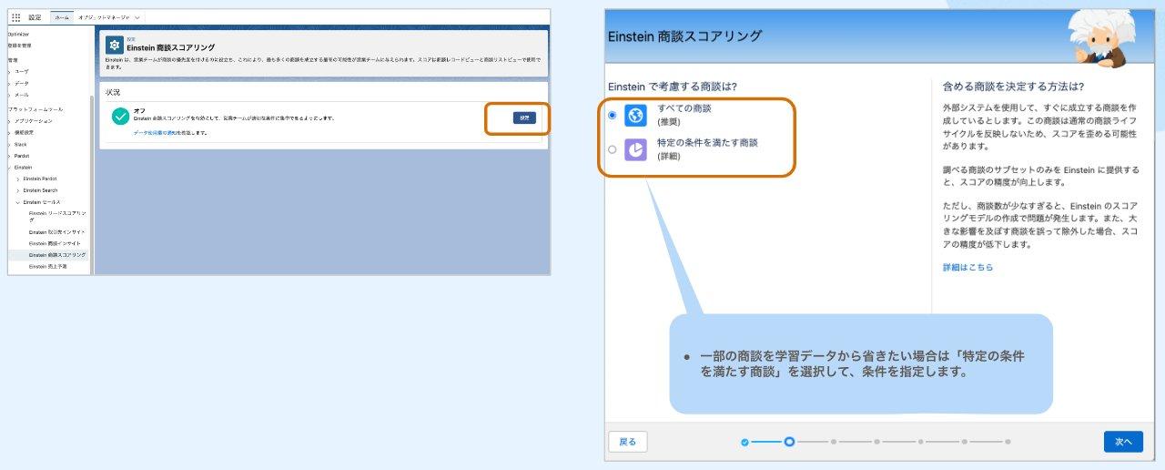 画面に従って設定を進めます。スコア算出に考慮したくないレコードがある場合「Einsteinで考慮する商談は?」で除外します。
