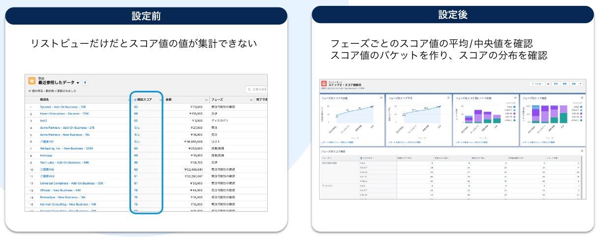 詳しい設定と確認方法を商談フェーズ毎のスコアを集計しようからご確認ください。