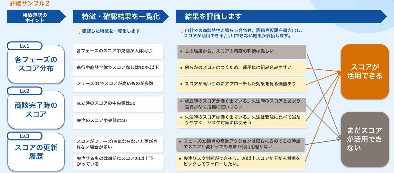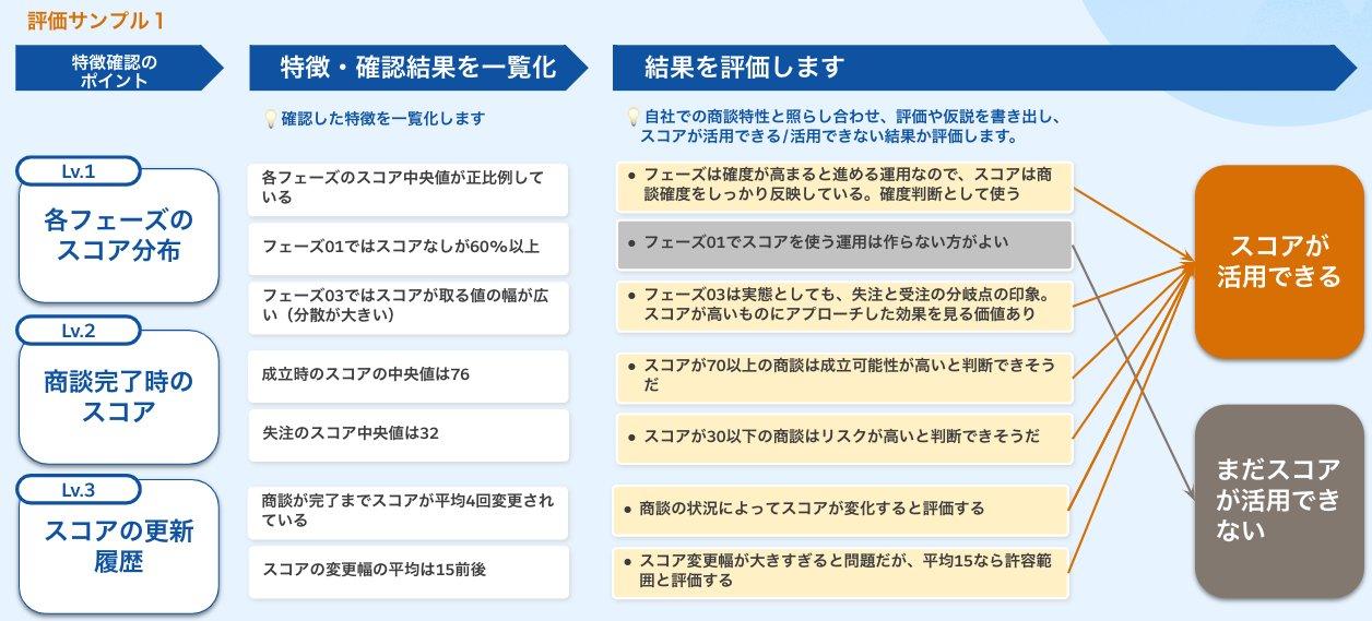 続いて、確認した結果を書き出し、スコア値の評価を行います。自社の商談運用特性を加味し、評価しましょう。また、評価結果が次のステップでの活用方法の検討に役立ちますので、しっかり評価結果を書き出しておきましょう。