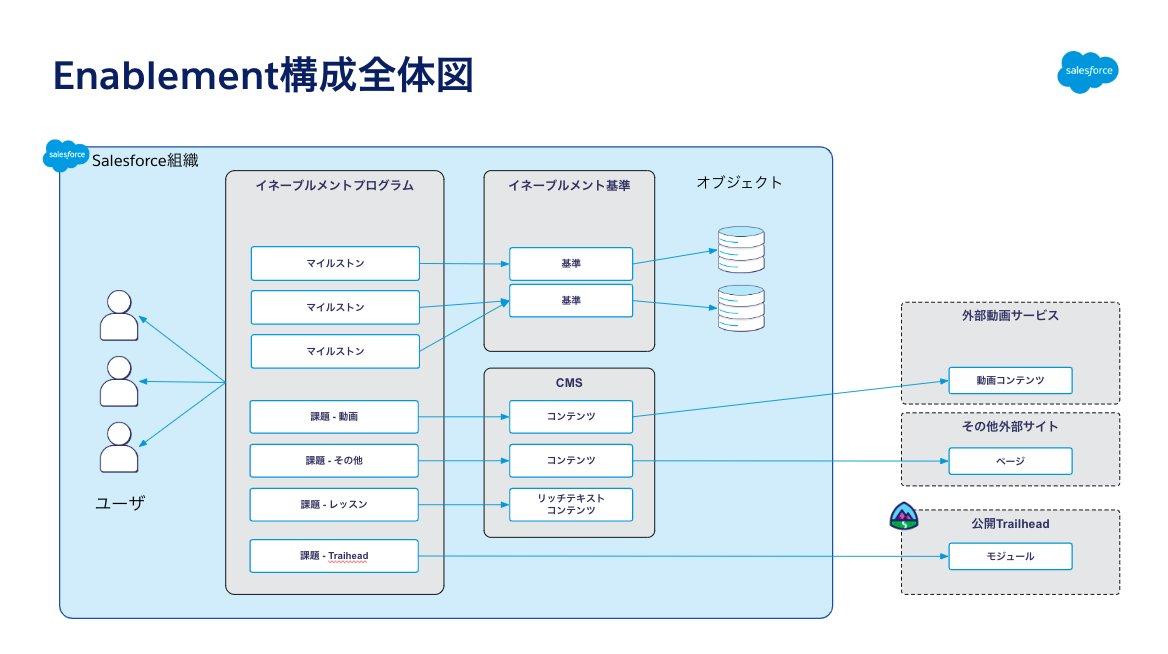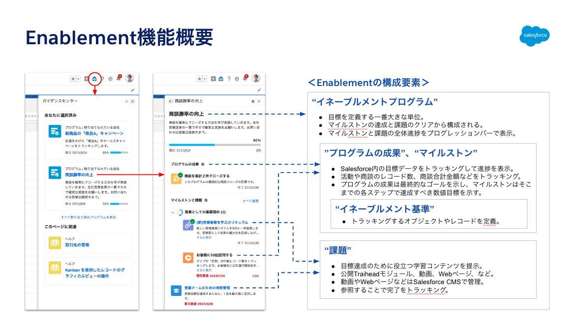 - Enablement機能は、Salesforceのイネーブルメント関連製品の中の1つの機能であり、ユーザのKPI達成を支援するプログラム施策の実行をサポートします。