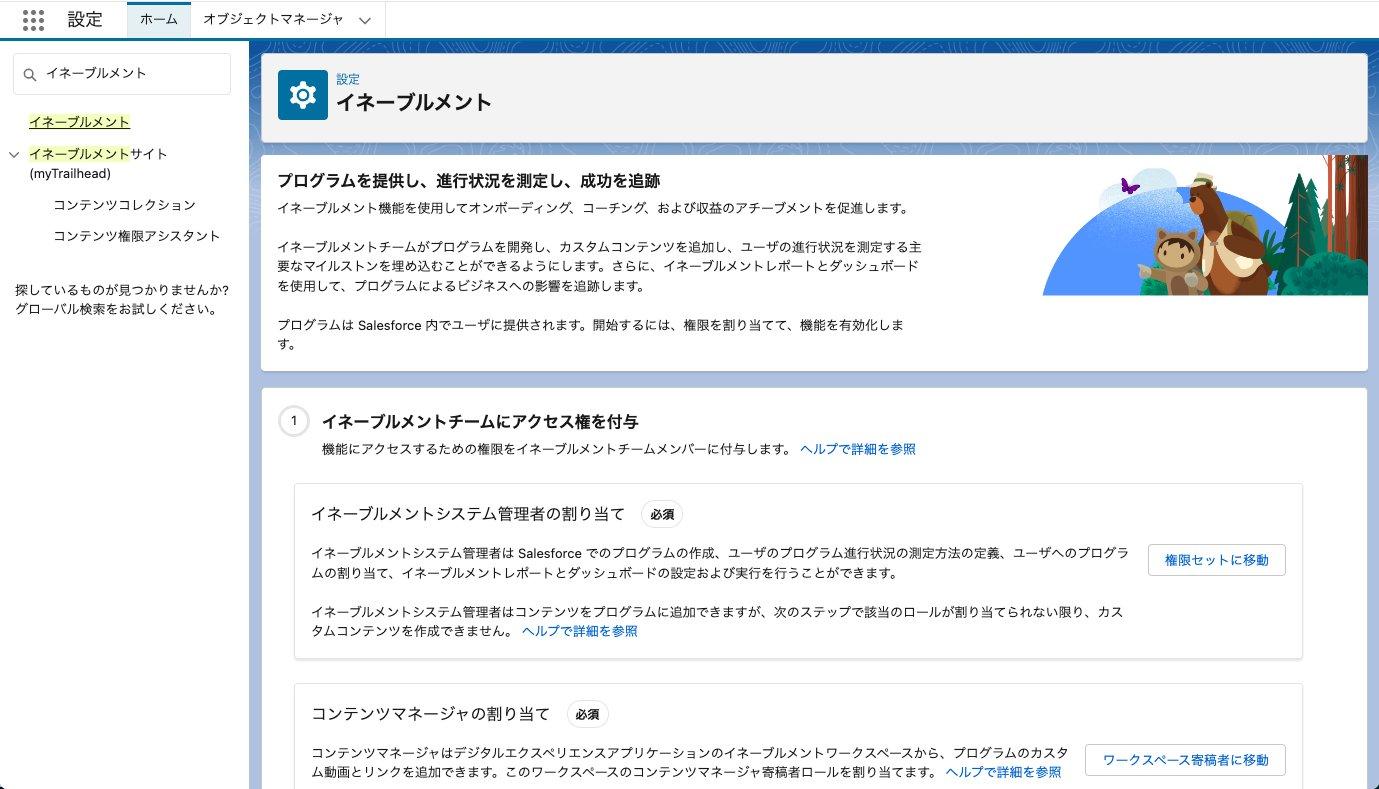 Enablementの環境セットアップとは、Enablement管理者や利用ユーザに権限をアサインする作業になります。設定画面には「イネーブルメント」というメニューがあり、該当の権限セットを探さなくても、ここから必要な権限を管理者やユーザにアサインできます。