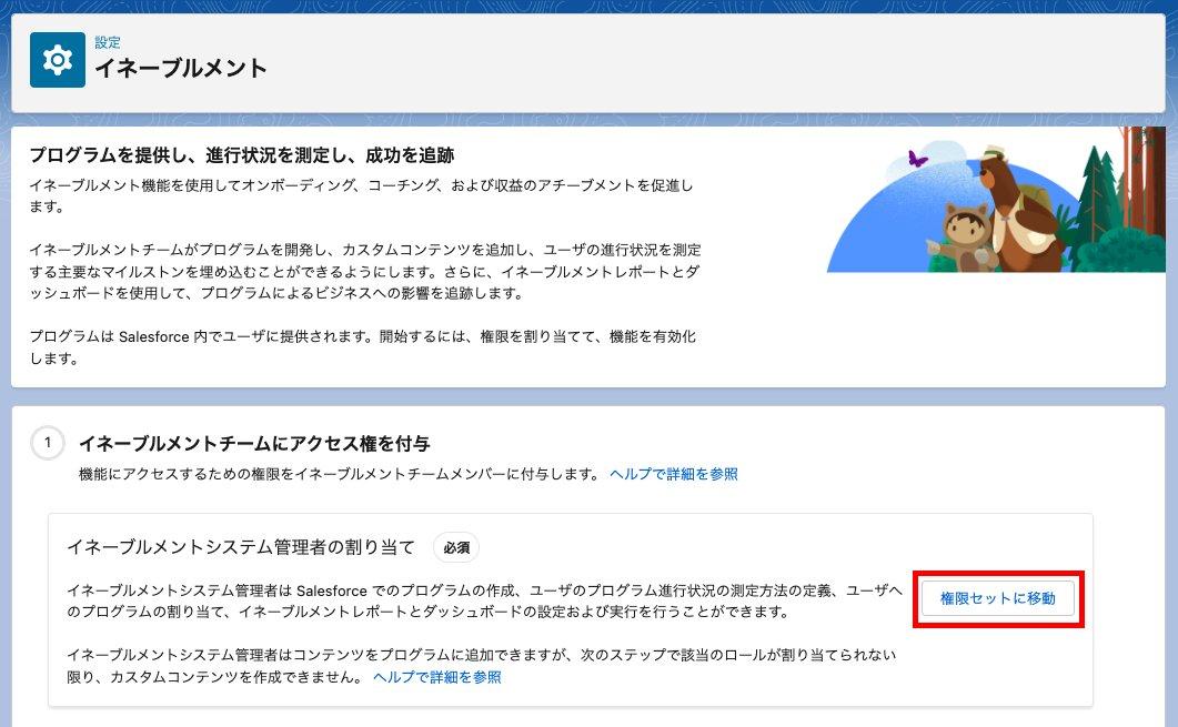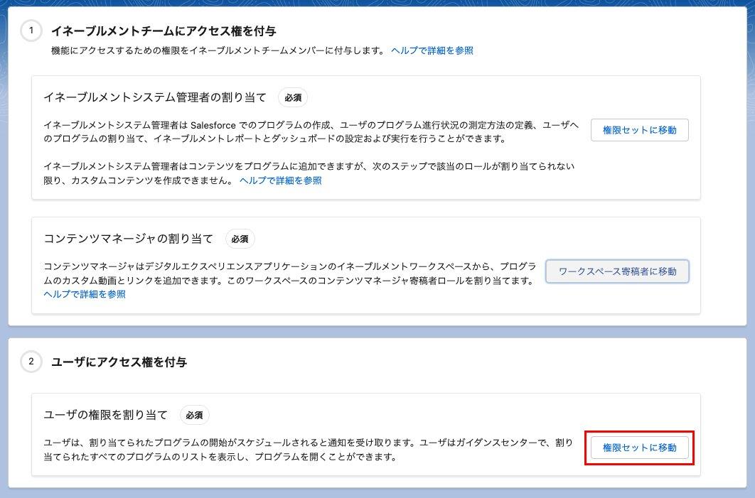 管理者はイネーブルメントプログラムの作成やユーザへの割り当てなどの権限を持ちます。「イネーブルメントシステム管理者の割り当て」の「権限セットに移動」ボタンをクリックします。
