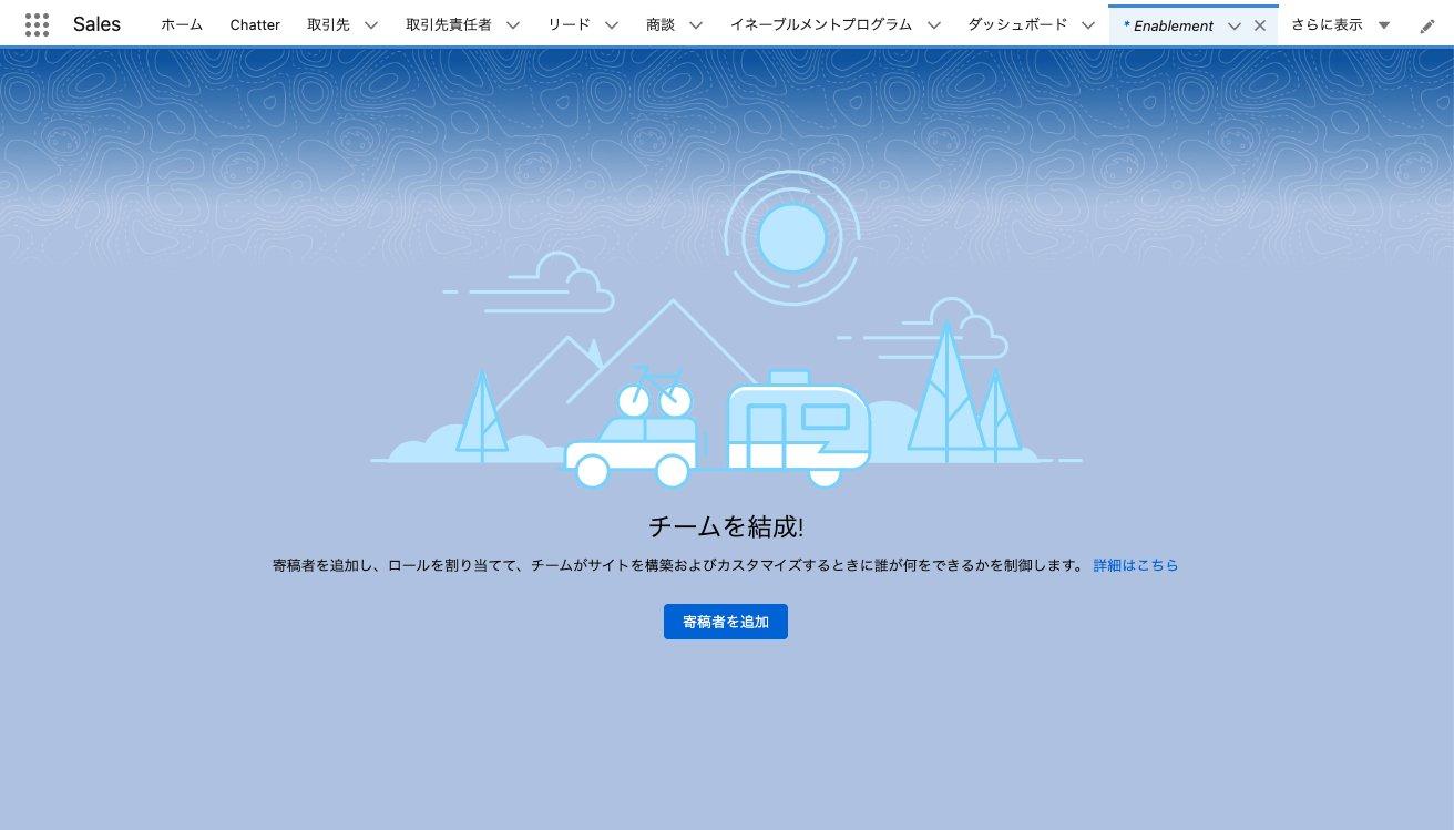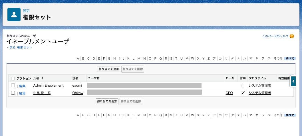 管理者用のデフォルト権限セット「イネーブルメントシステム管理者」の画面に遷移するので、管理者ユーザを追加します。