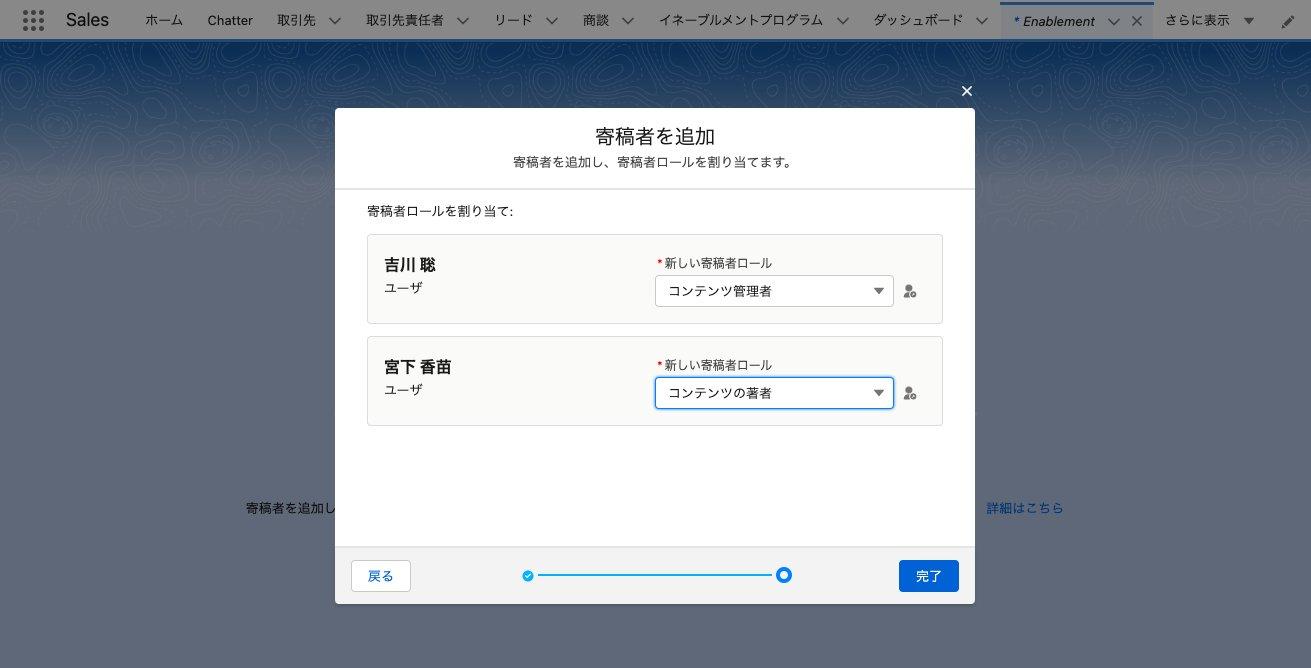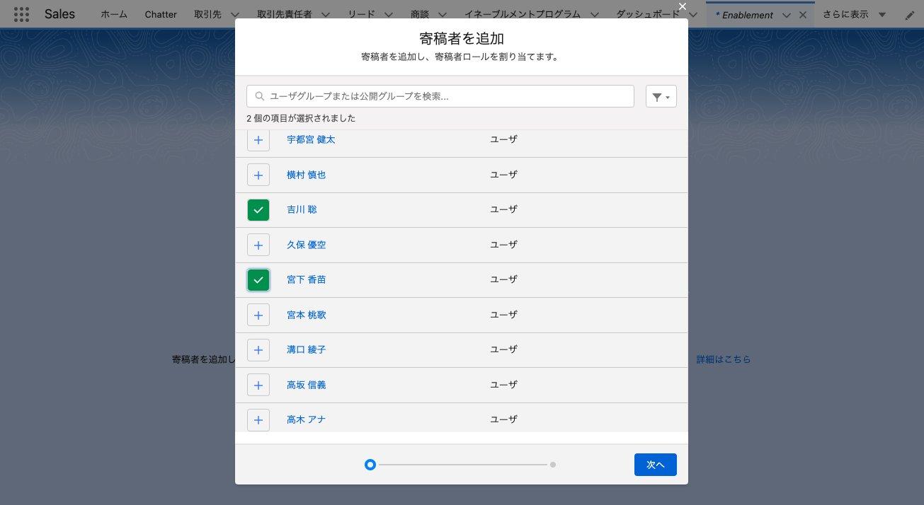 Enablement用Salesforce CMSの管理者やコンテンツ作成者を選択し、「次へ」ボタンをクリックします。