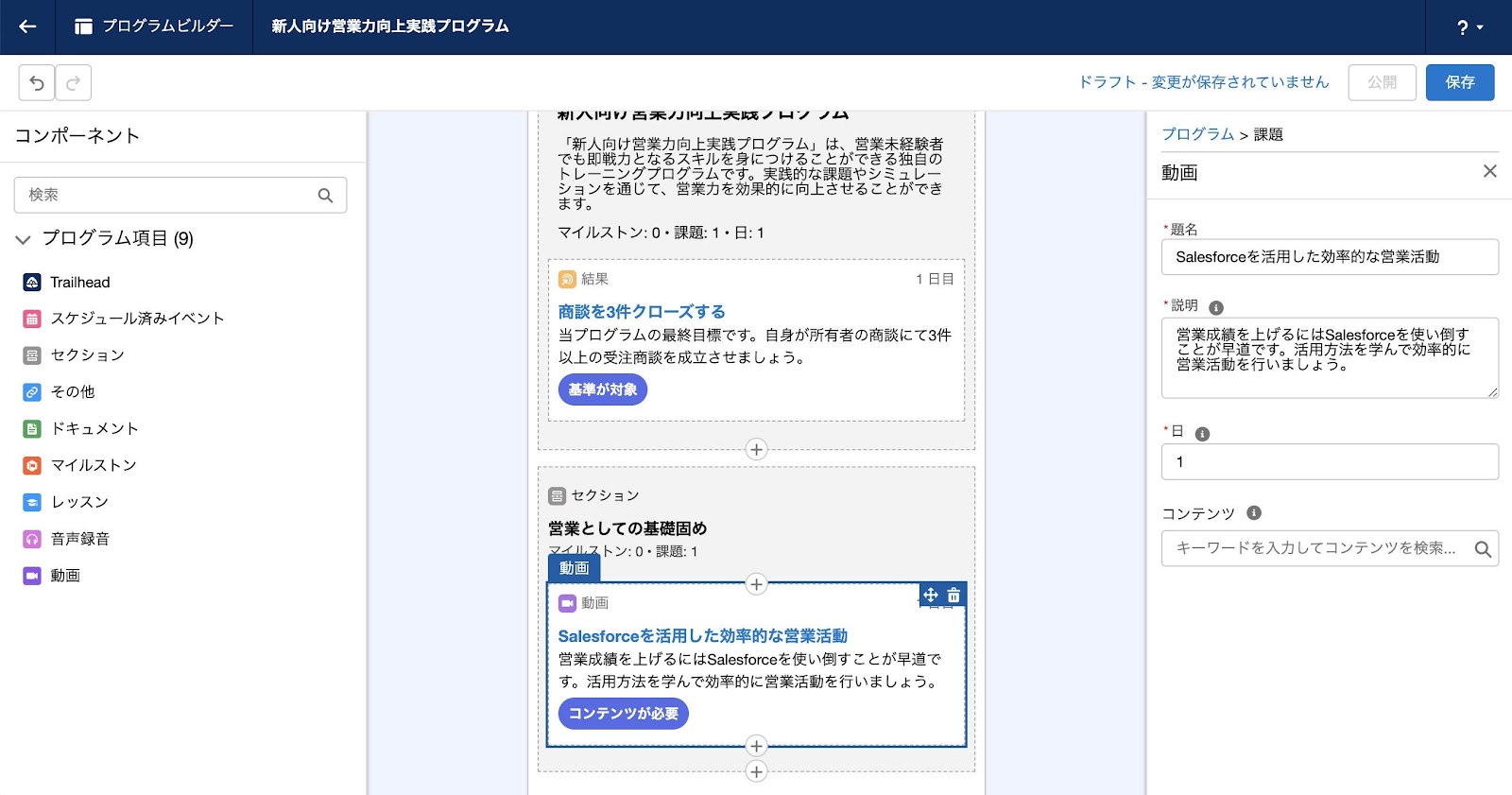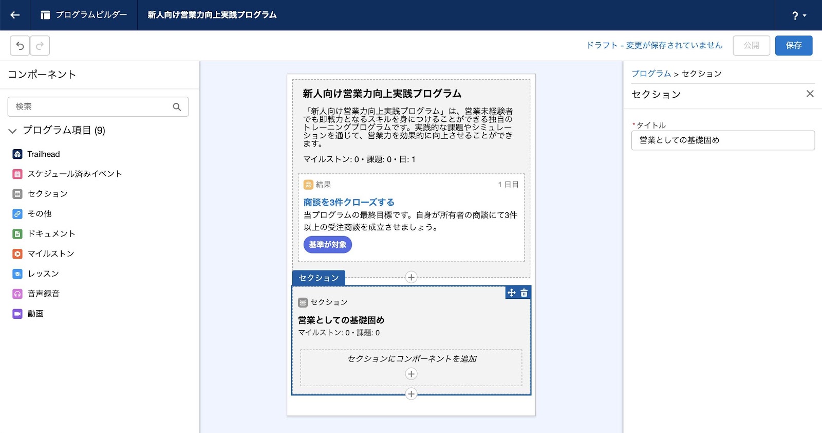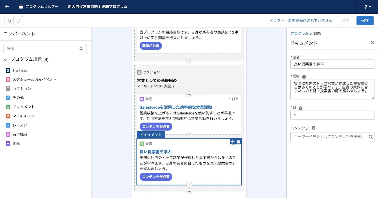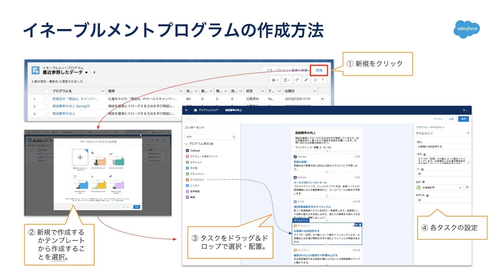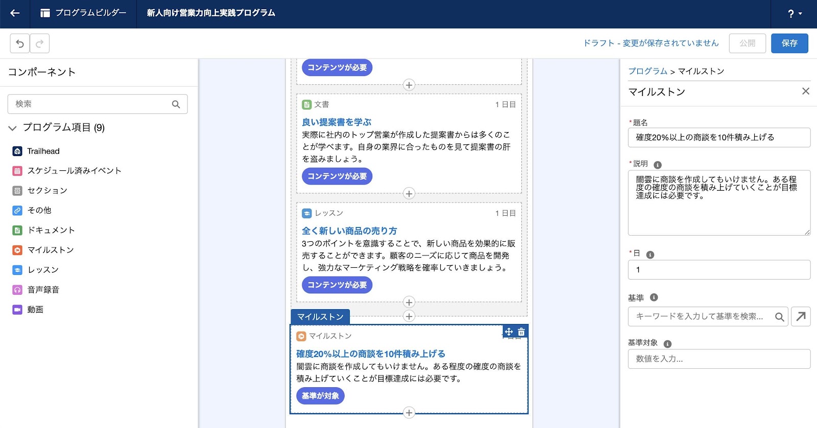 - イネーブルメントプログラムは、プログラムビルダーを使ってドラッグ&ドロップでマイルストンや課題を配置して視覚的に簡単に組み立てることができます。