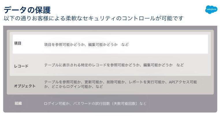 Salesforceでは、項目レベル、レコードレベル、オブジェクトレベル、組織レベルで様々なアクセスの制御、データの保護のための機能を提供しております。