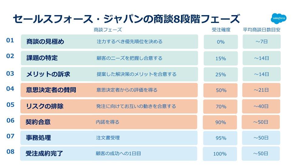 実際にセールスフォース・ジャパンでも以下のように8段階フェーズで商談の進捗を管理し、マネジメントを行なっています。