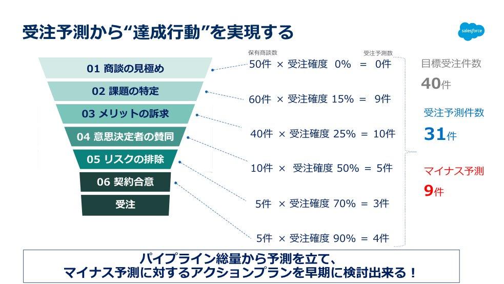 商談フェーズを定義することで、その商談が今どういった状況なのか?その商談の受注の確率はどれくらいなのか?を把握し、売上予測を立てたり、マネジメントとして必要な支援を検討することができるようになります。