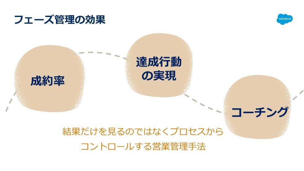 なかなか成果が上がっていない営業担当などは、標準化されたフェーズ管理を行うことで、自身が詰まりやすいフェーズがどこなのか、トップセールスの成功体験をもとにしたフェーズ管理を通して自らが体感することで、それぞれに合った改善点が明確になり、達成行動の実現につながります。