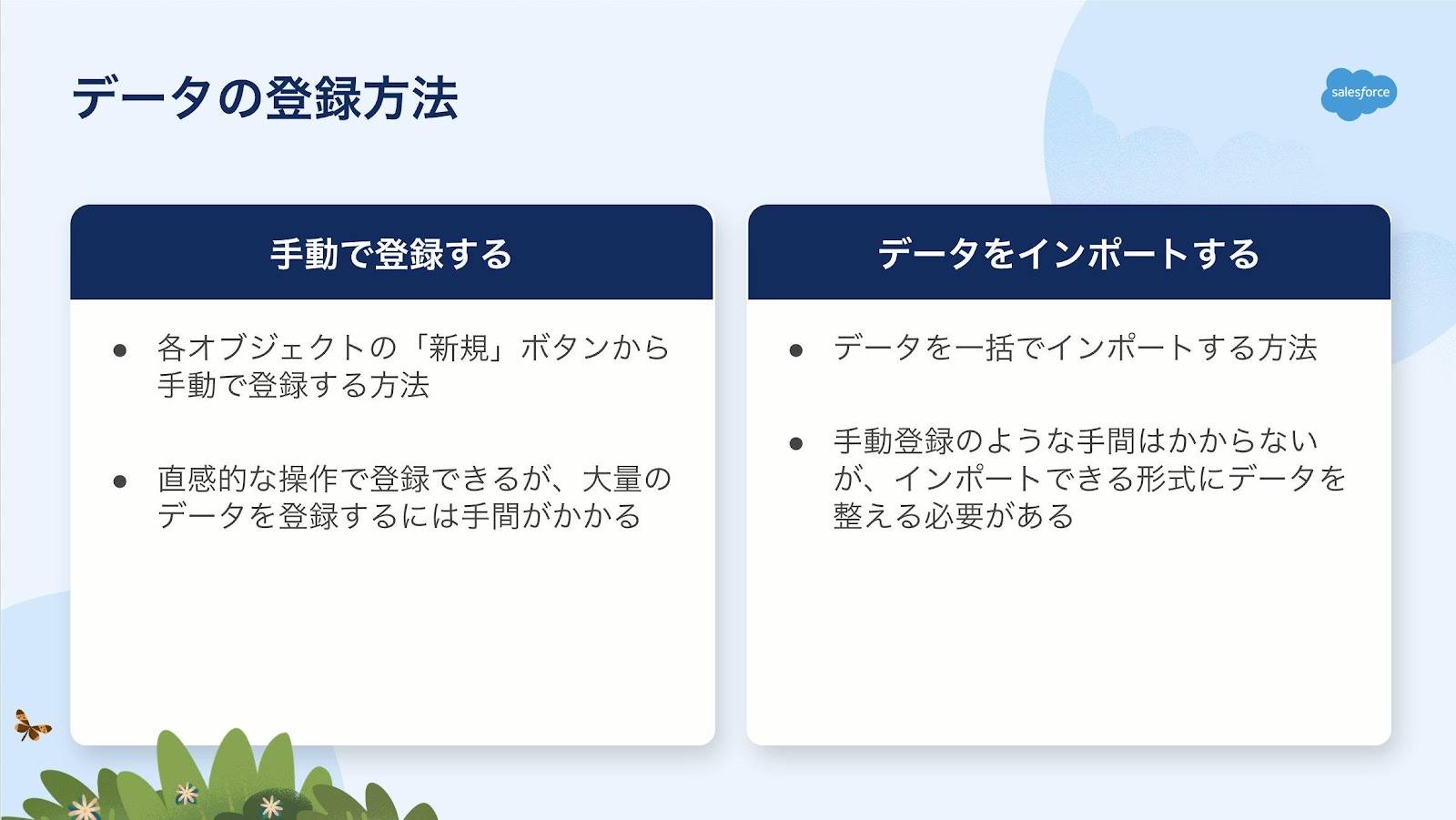 Sales Cloudへデータを登録するための方法には主に2通りの方法があります。