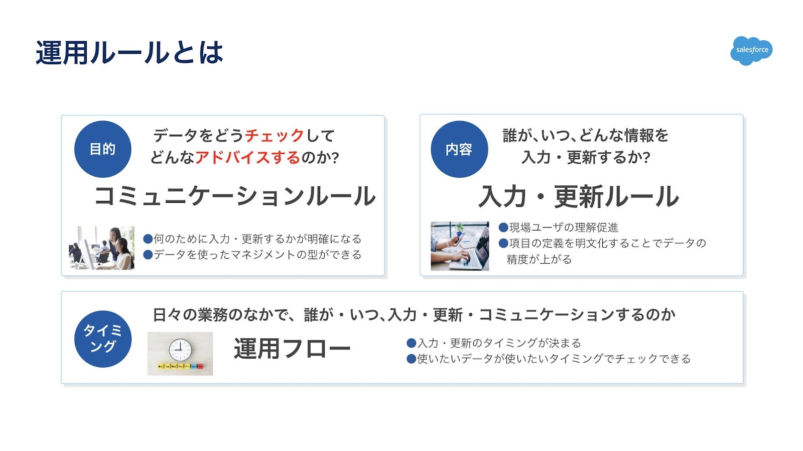 運用ルールは”Sales Cloudの定着化”した状態を、具体的に定義したものです。
