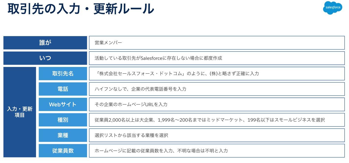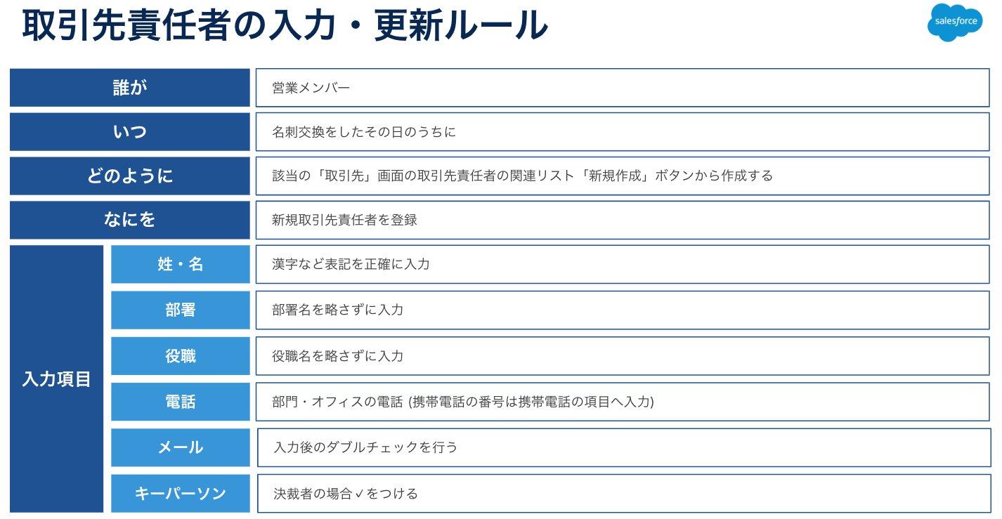 運用ルールは、日々の業務でSales Cloudを利用する上で「誰が」「いつ」「何を」「どのように」確認/入力するのかを定めたものです。
