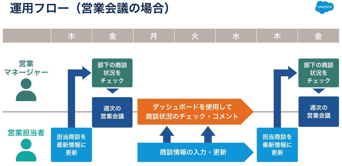 例えば、週次の営業会議でマネージャーがデータを確認しフィードバックする場合、下図のような運用フローにまとめることができます。