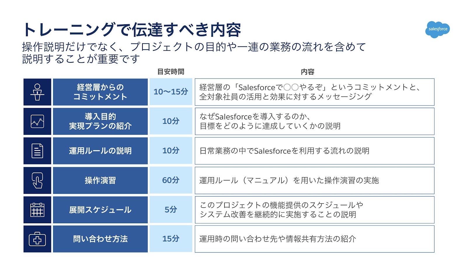 Sales Cloud運用開始に向けたトレーニングは、利用目的や利用シーンをしっかりと伝達し、利用ユーザーに腹落ちして使用してもらうことを目的とします。