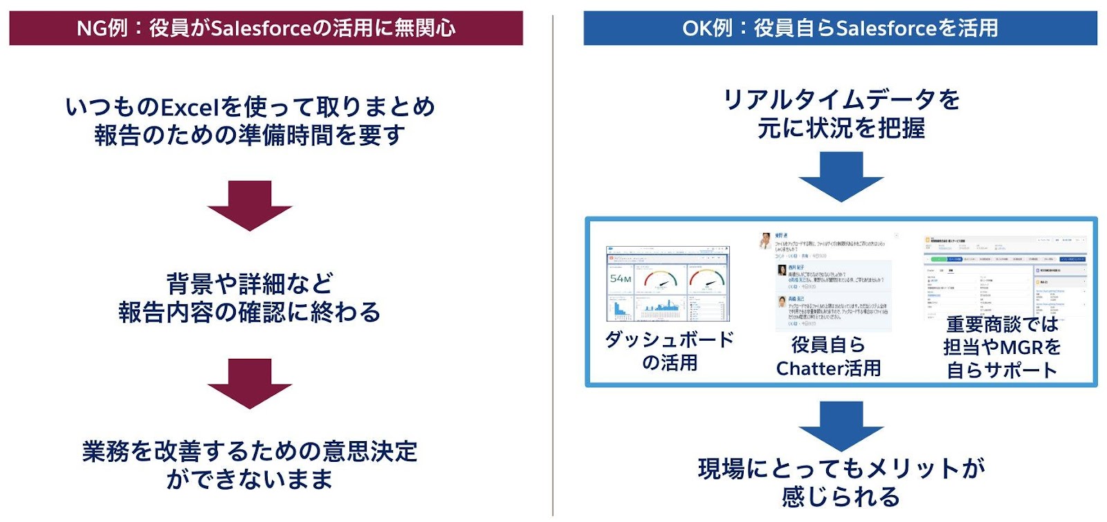 また、経営層を巻き込み、経営層自らがSales Cloudを活用することで、利用ユーザーに入力メリットを訴求できるといった副次的な効果も期待できます。