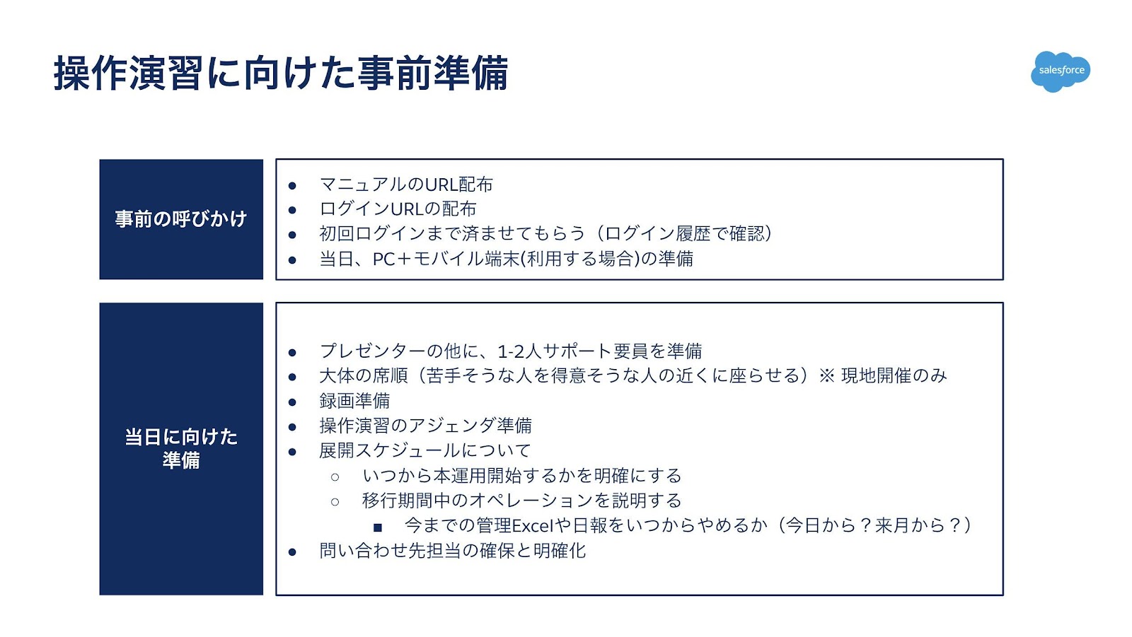 初回の操作演習では、特に利用ユーザーがつまづく点が多いので、以下のような事前の呼びかけと準備をしておくといいでしょう。