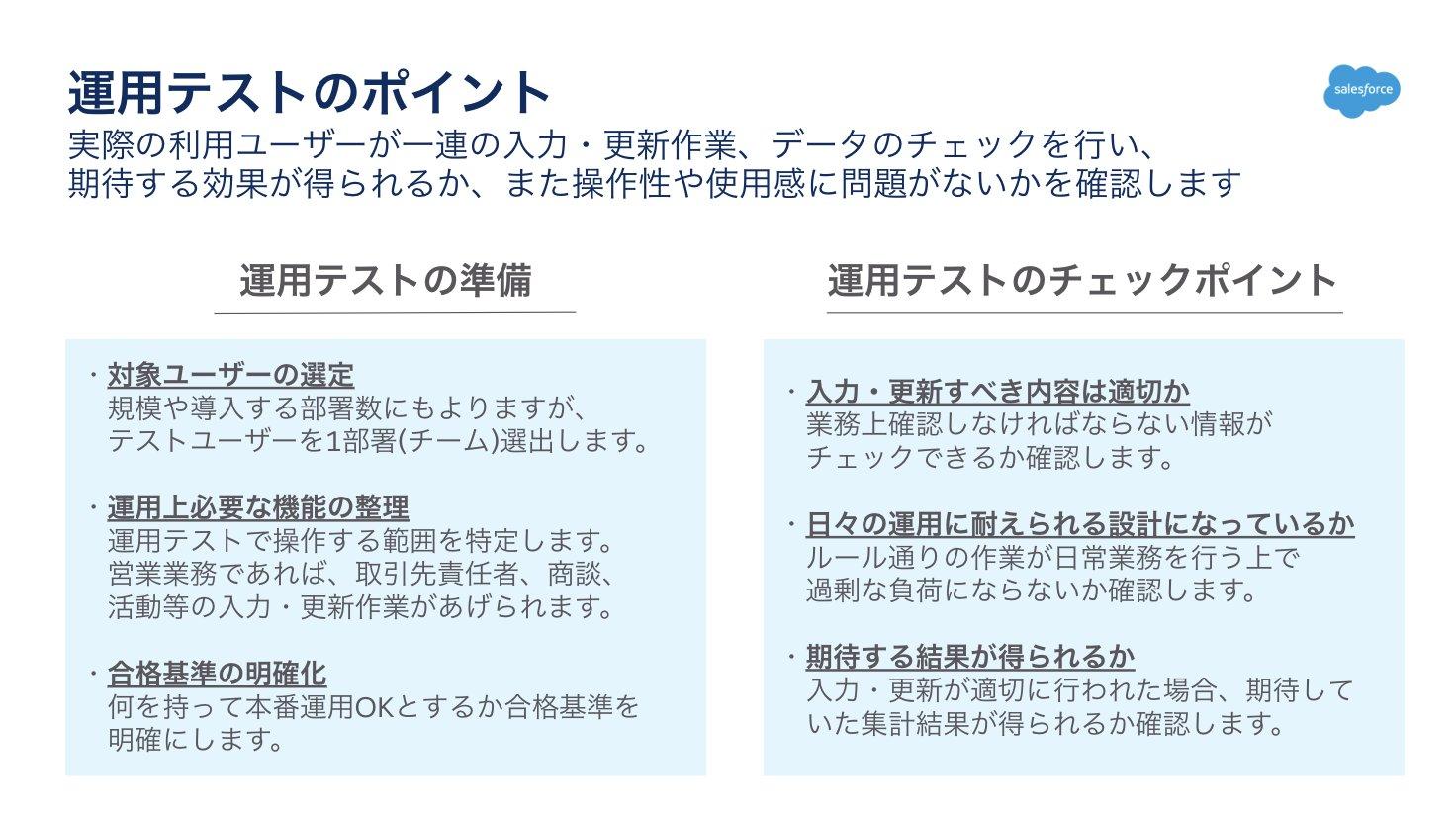 運用テストを実施する前に、テストの準備と、テスト時にどのようなポイントをチェックするのかを整理しておきましょう。