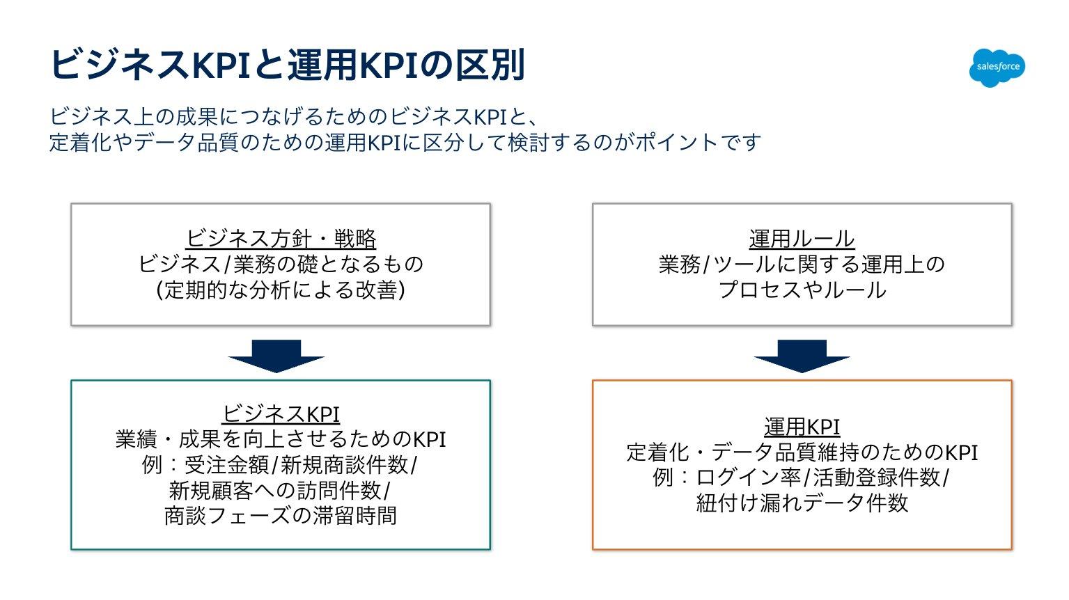 複数部門でSales Cloudを活用する場合は、部門ごとにKPIを設定することで、どの部門があまり定着していないのかなども分析できるようになります。