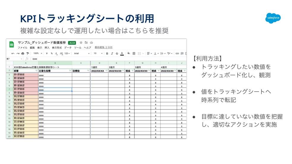 値を時系列で分析するにあたって、Salesforceでは設定の難易度がやや高く設定が難しい場合や、TableauなどのBIツールのご利用が難しい場合は、KPIトラッキングシートを使った記録も可能です。