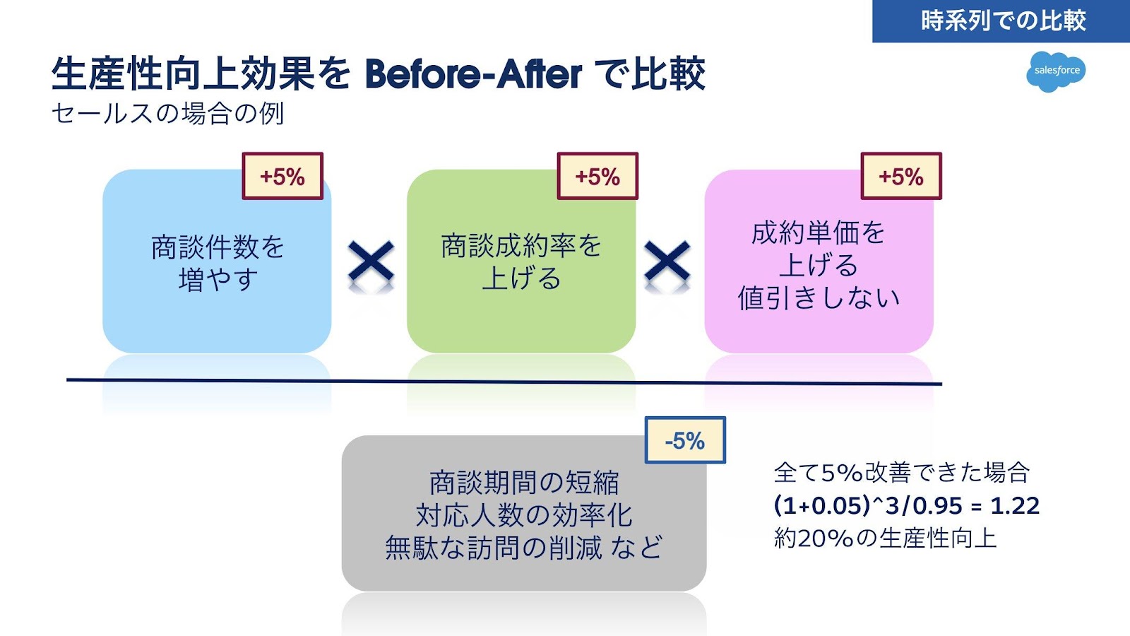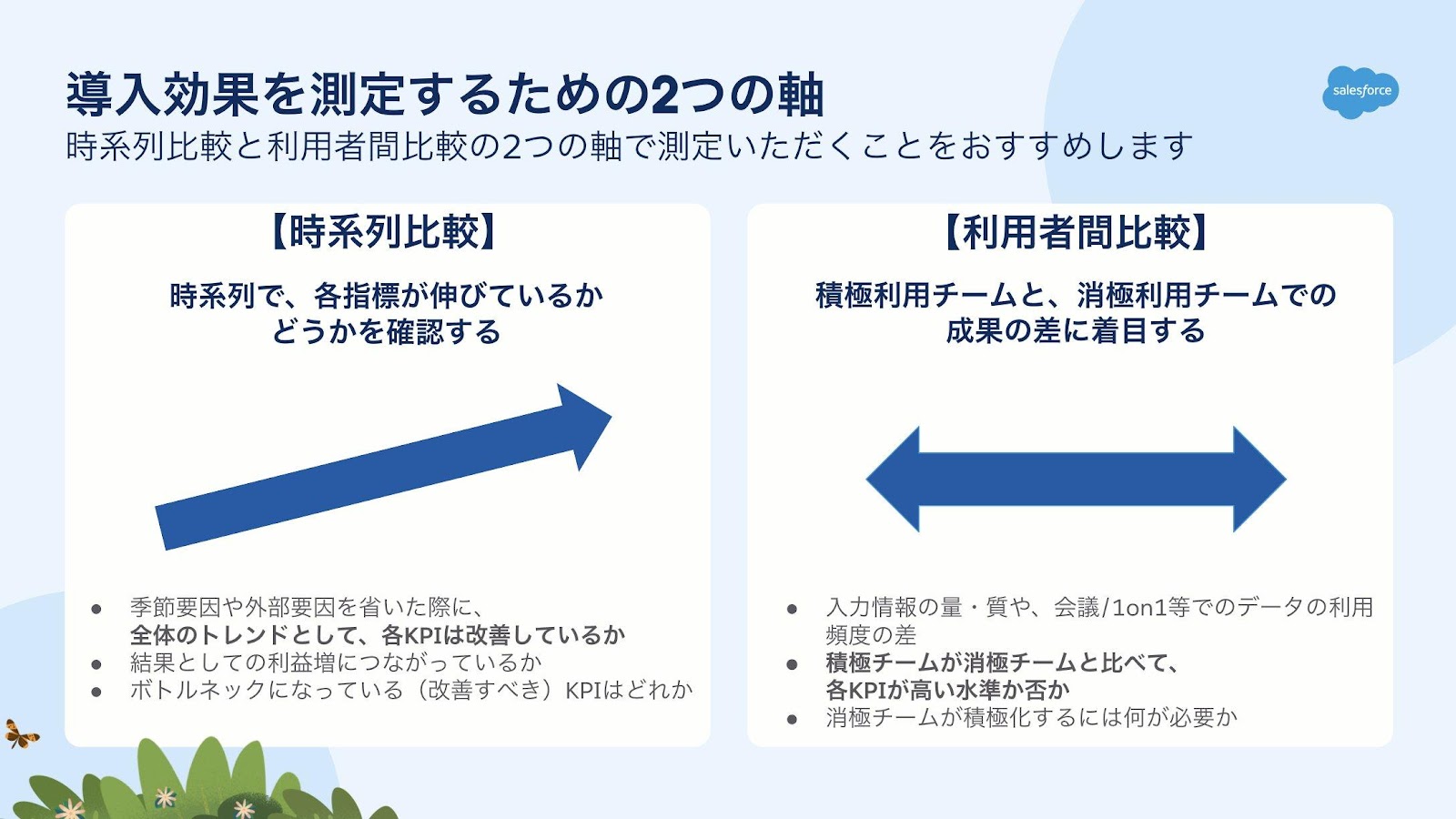 Sales Cloudの導入効果を測る上では、時系列比較と利用者間比較の2つの軸でチェックいただくことをおすすめします。