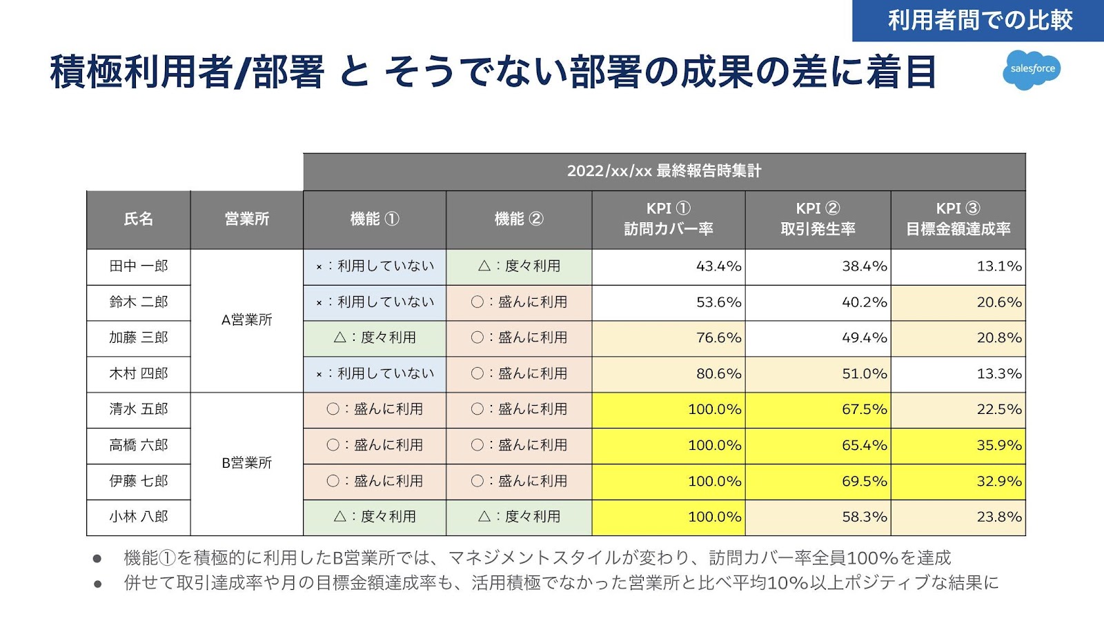 自社で定めたKPIを人別に可視化し比較することで、Sales Cloudの導入効果を検証することが可能です。