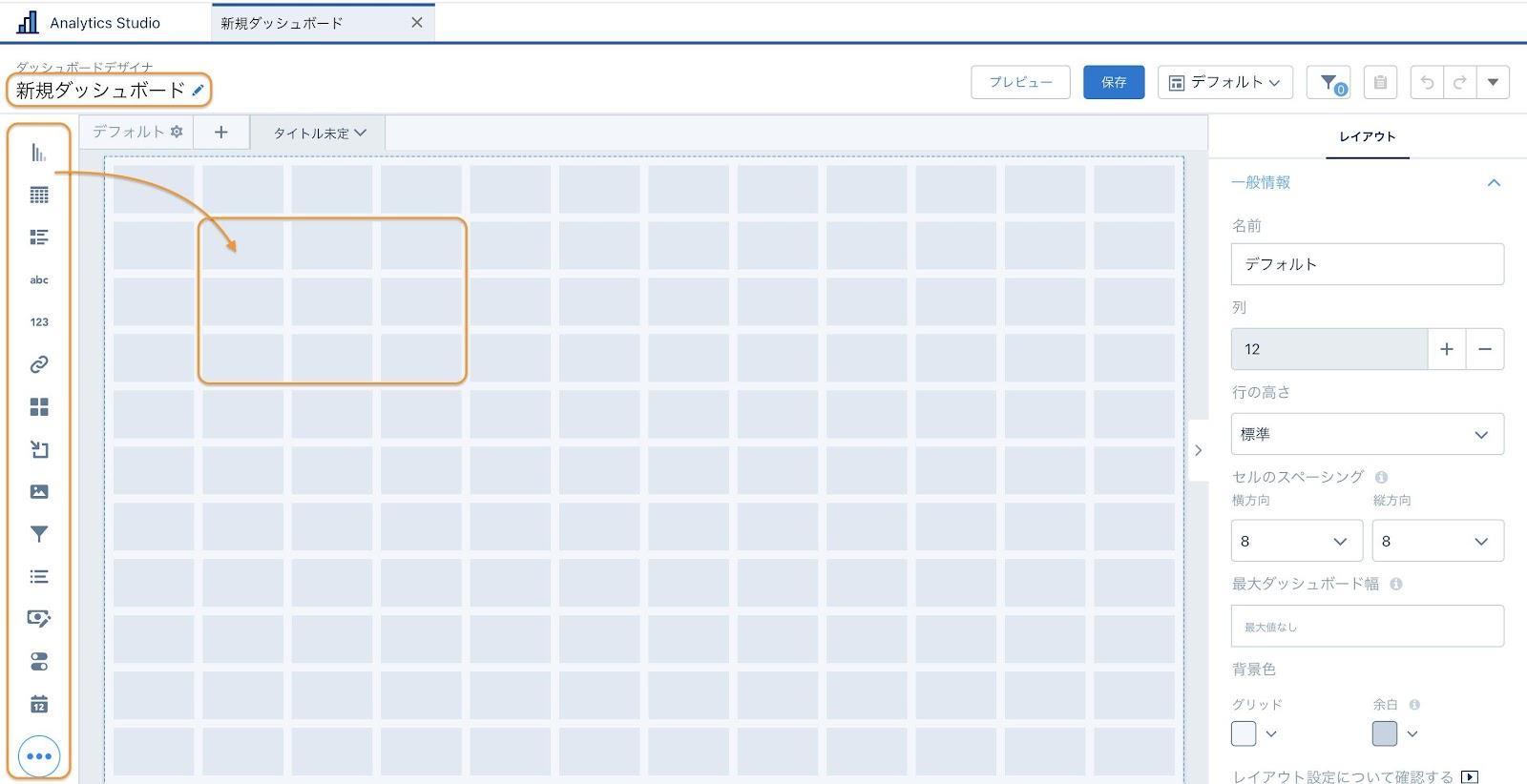 グラフや表形式等選んでいただくことができますので、任意のウィジェットをマス目状のダッシュボードキャンバスへドラック&ドロップさせることで配置が可能です。