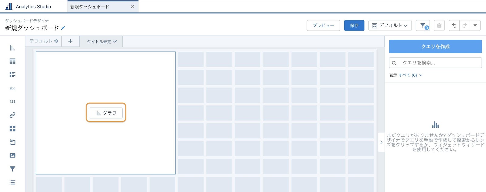 空白のダッシュボードの準備ができたら、ダッシュボードに各種ウィジェットを配置していきます。