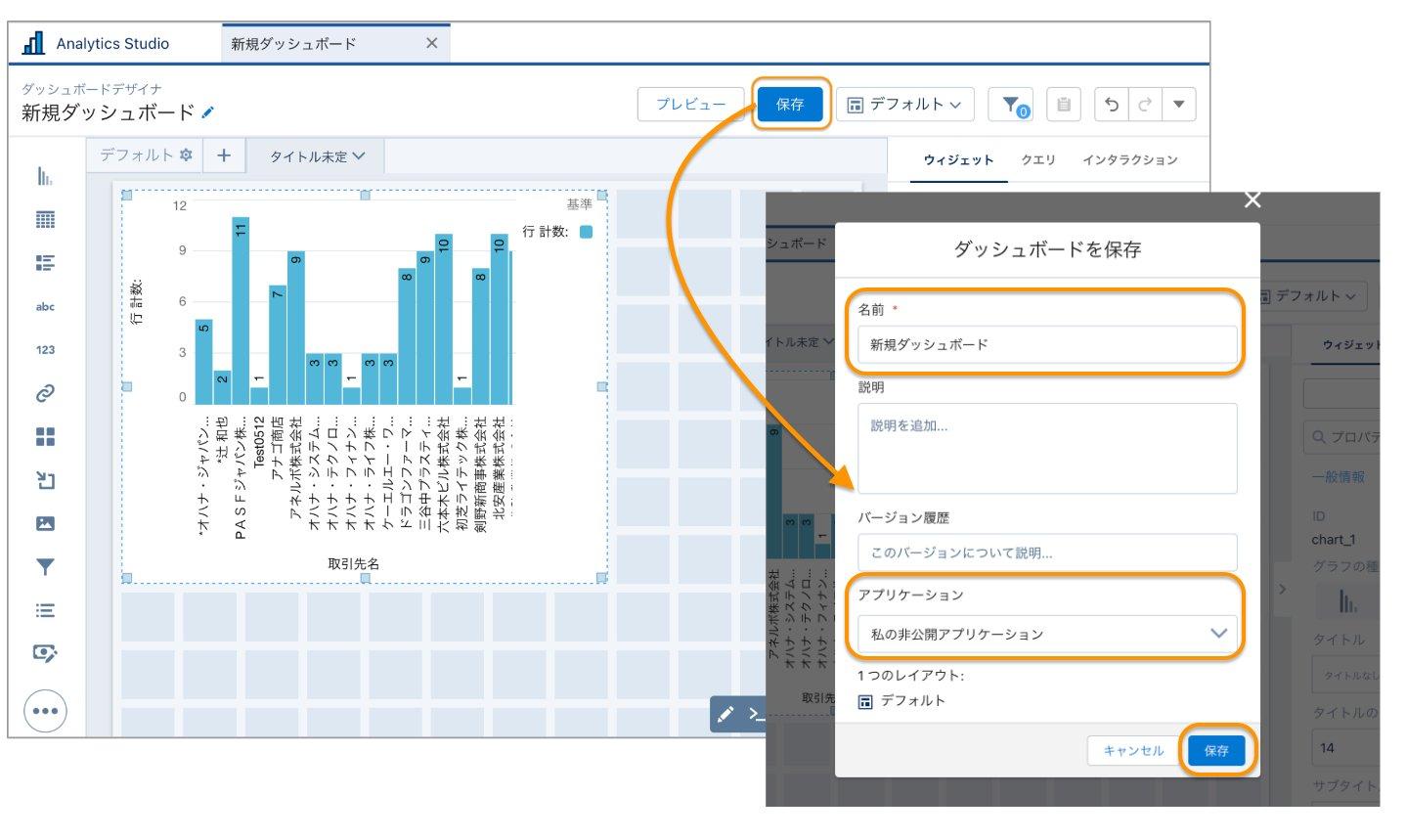 ダッシュボード名、ダッシュボードの保存先アプリケーションを設定の上、再度 [ 保存 ] ボタンをクリックします。