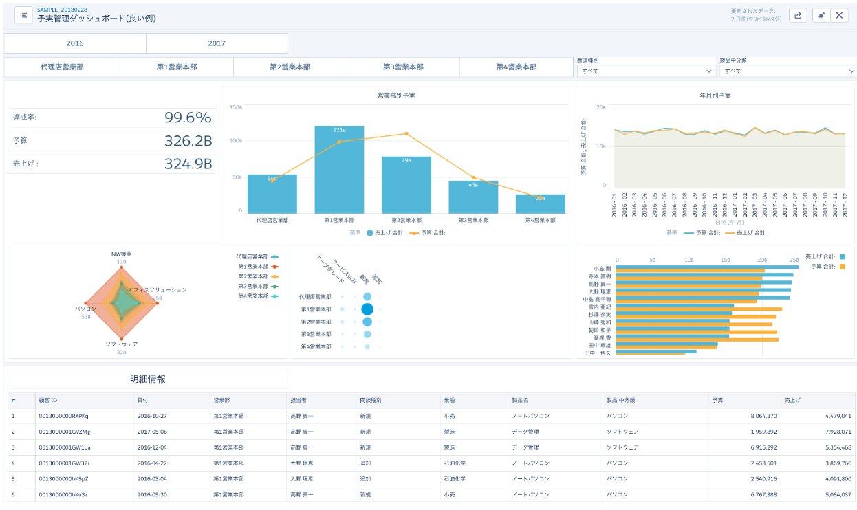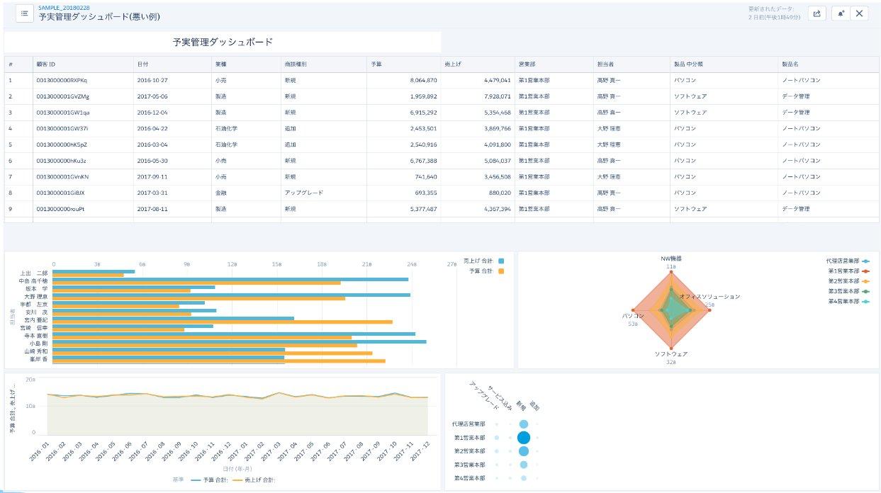 - 概要を把握できるグラフがないので、数値ウィジェットや営業部別の予実グラフを作成する
