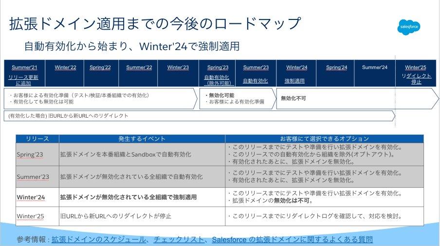 前述しました通り、Winter '24 で拡張ドメインが強制適用されると、その後、管理者様は拡張ドメインを無効化することができません。拡張ドメインは影響度の大きい更新であるため、Winter '24 のリリースまでに適用できるようにお客様側でのご準備をお願い致します。