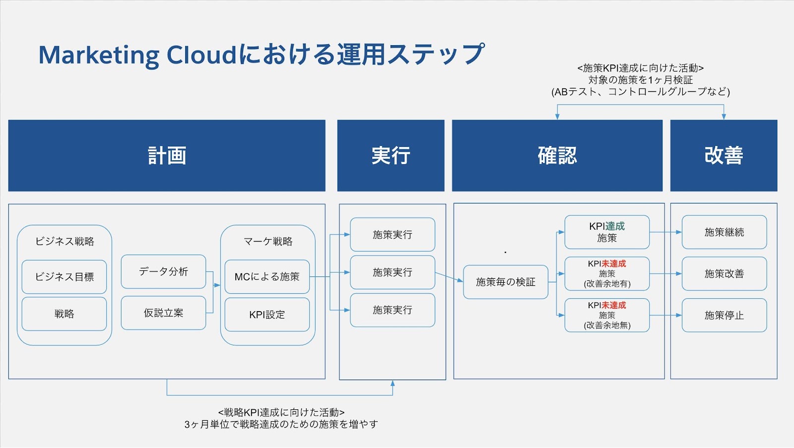運用するには事前に戦略やKPIを定めておき、そのKPIを達成するために普段に施策を運用します。運用する上では施策単位で継続するか改善するか停止するかをKPIを基準に判断していきます。