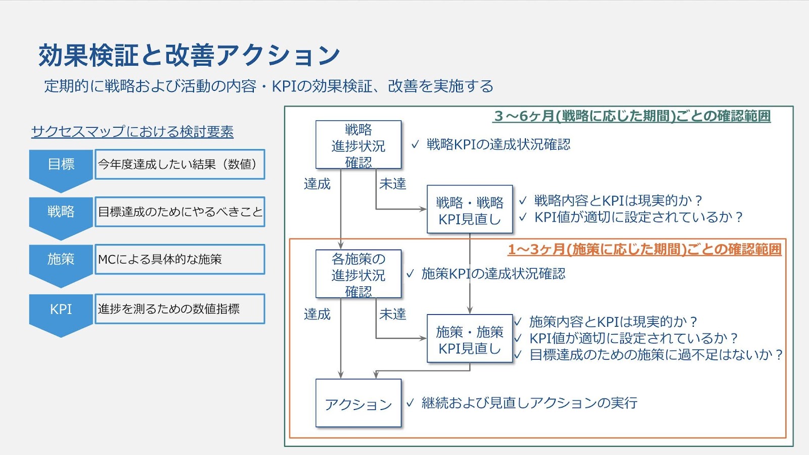 活用STEPのはじめにも案内しましたが、体制と役割を明確にしておくこと(以下図1)。目標と戦略、施策を明確(以下図2)。にしKPI(以下図3)。を定めることになります。ここを決めておくことで、実施した後に振り返り(以下図4)。、改善をしていけます(以下図5)。