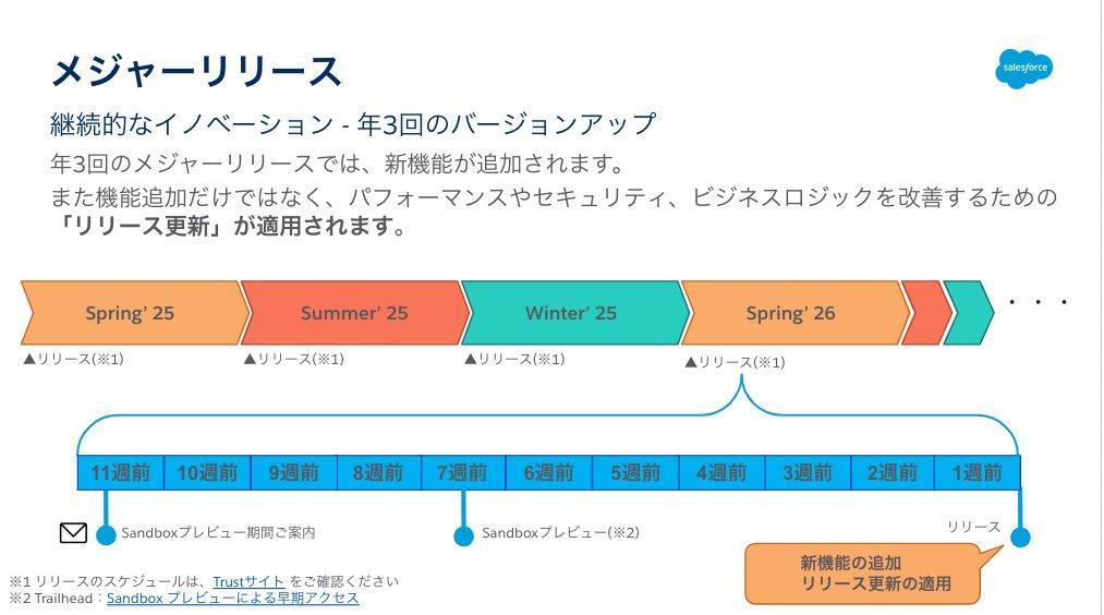 システム管理者様であるみなさまは、Salesforceに年3回のメジャーリリース(バージョンアップ)があることはご存知かと思います。以下は、メジャーリリースの流れを図にしたものです。