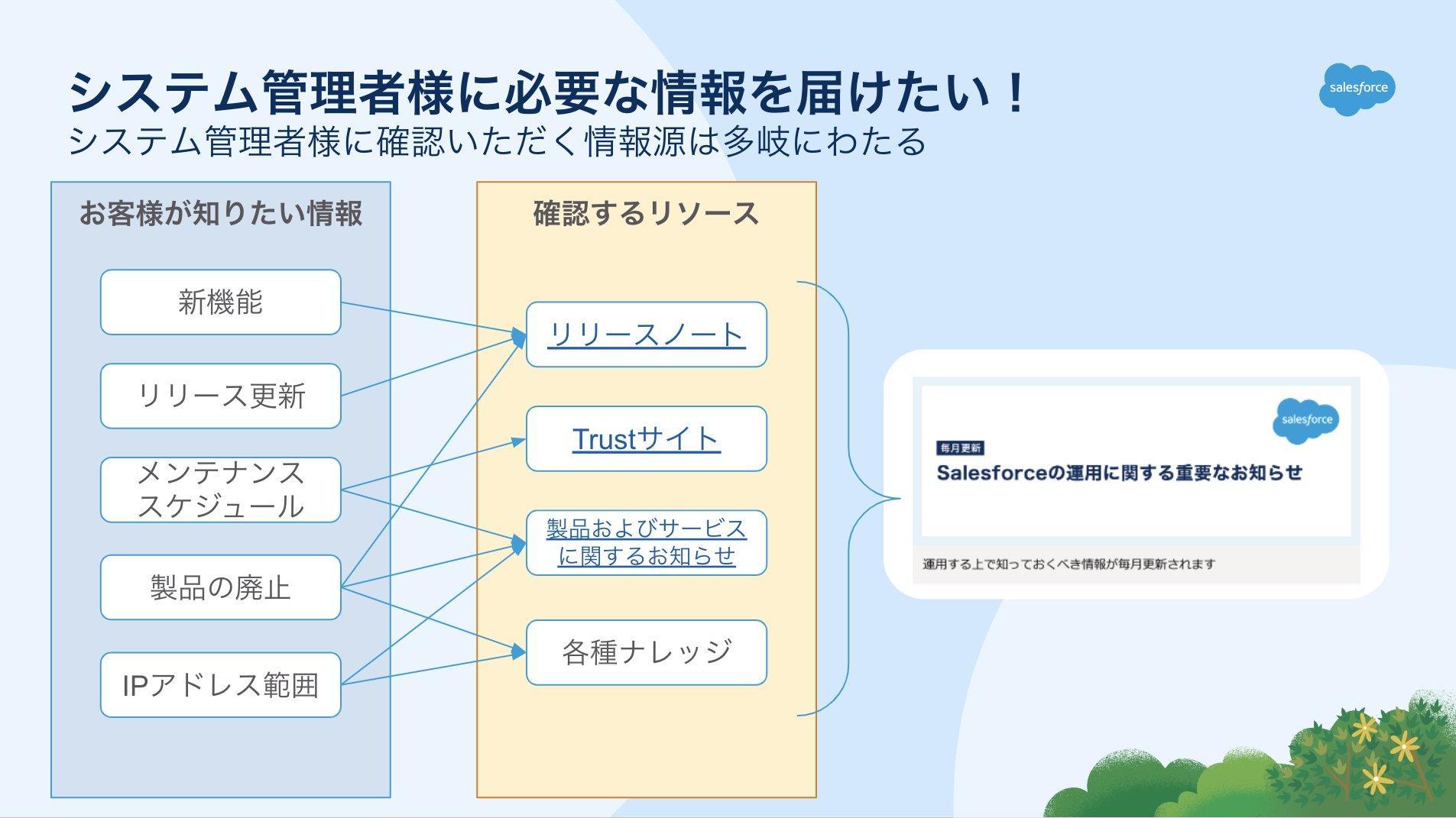 - 「Salesforce の運用に関する重要なお知らせ」を提供している背景を知ることができます