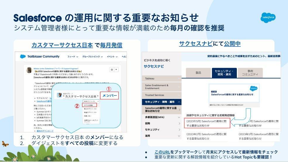 「Salesforce の運用に関する重要なお知らせ」では、Salesforce Platform に関するメンテナンス情報、技術情報、セキュリティ関連情報などの中から、システム管理者様にご認識いただきたい重要な情報を抜粋してご紹介しており、カスタマーサクセス日本で最新版を毎月共有しています(サンプル)。