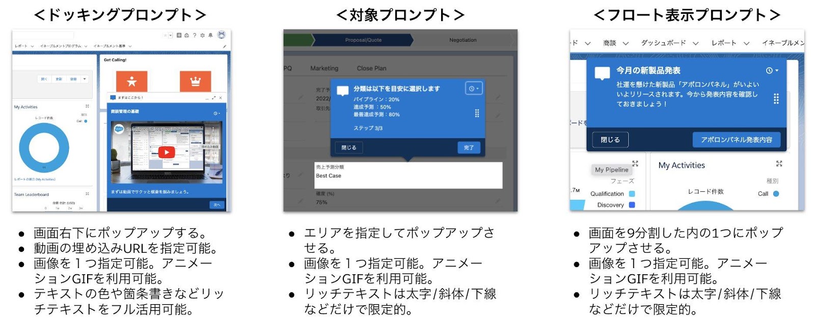 以下3種類のプロンプトを表示できます。表示対象の場所(アプリケーション、オブジェクト、Lightningページ)を指定したり、表示スケジュールや頻度や表示対象ユーザをプロファイルで指定することも可能です。