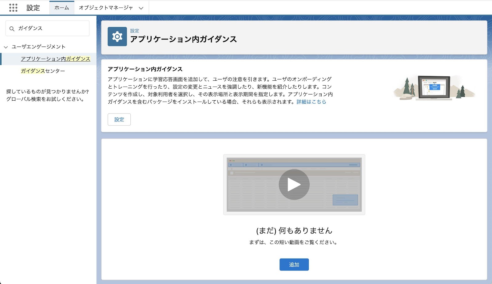 アプリケーション内ガイダンスはDeveloper Editionを含み、Essential Edition以上の全てのSalesforce Editionで利用可能です。左図の設定画面からセットアップしますのでこの画面がアクセス可能か確認します。