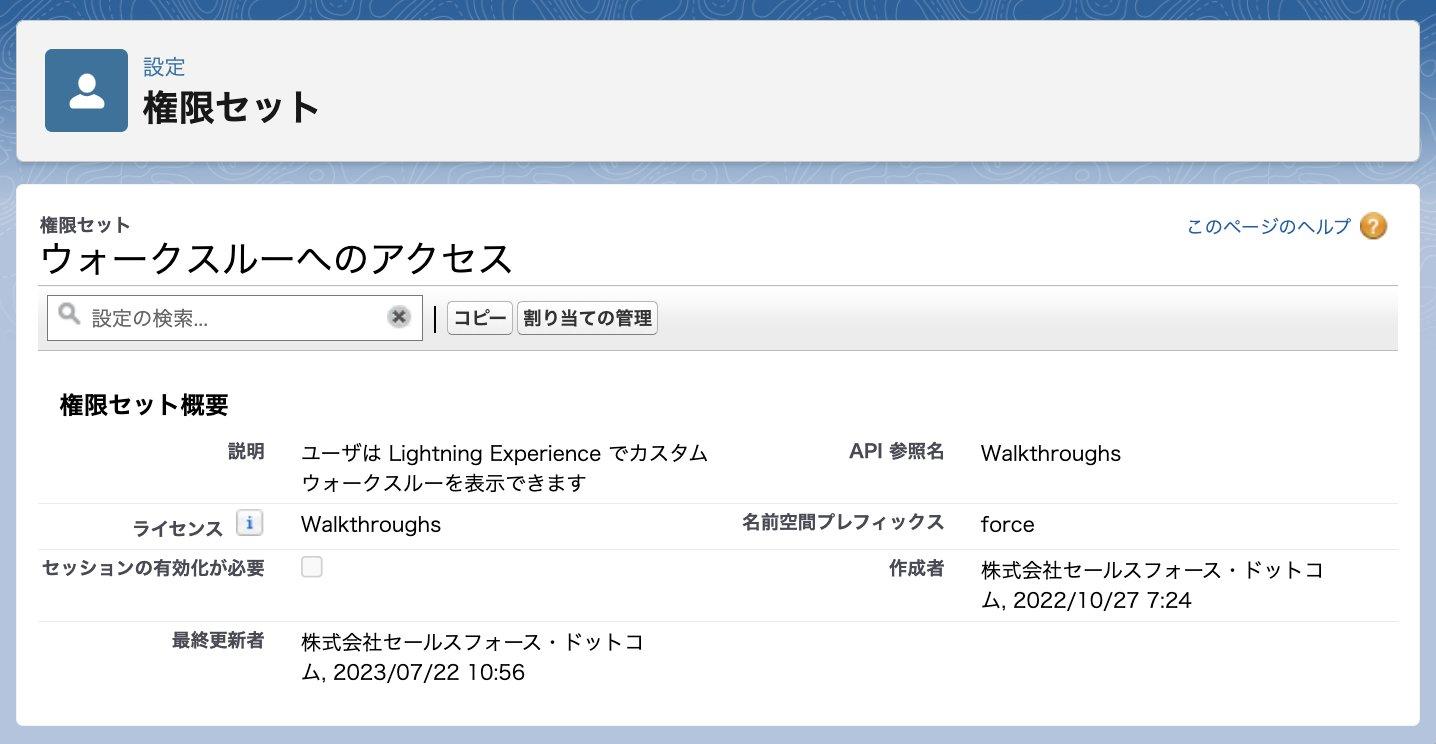 有償ライセンスでウォークスルーを使用する場合は、利用ユーザに権限セット「ウォークスルーへのアクセス」を割り当てます。