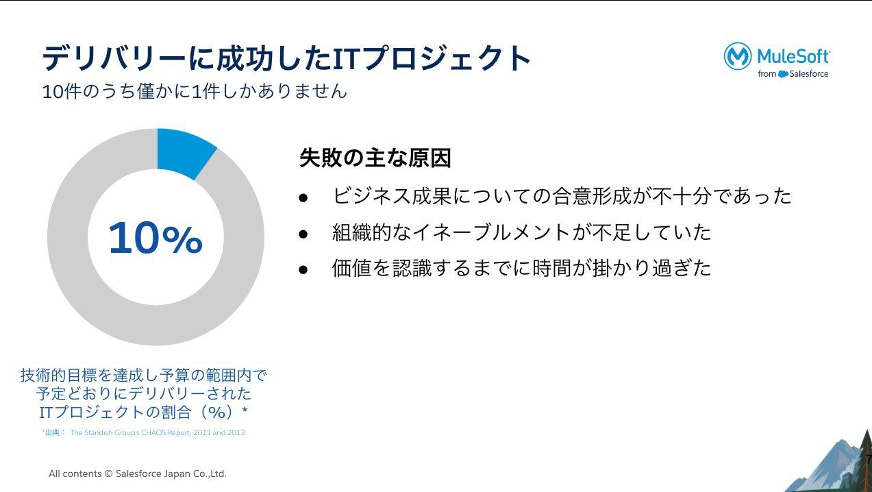 技術的目標を達成し、且つ予定通りに成果物がデリバリーされたITプロジェクトの割合を例にして、MuleSoftの掲げるAPIネットワーク構築推進のためのメソドロジーについて説明しています。