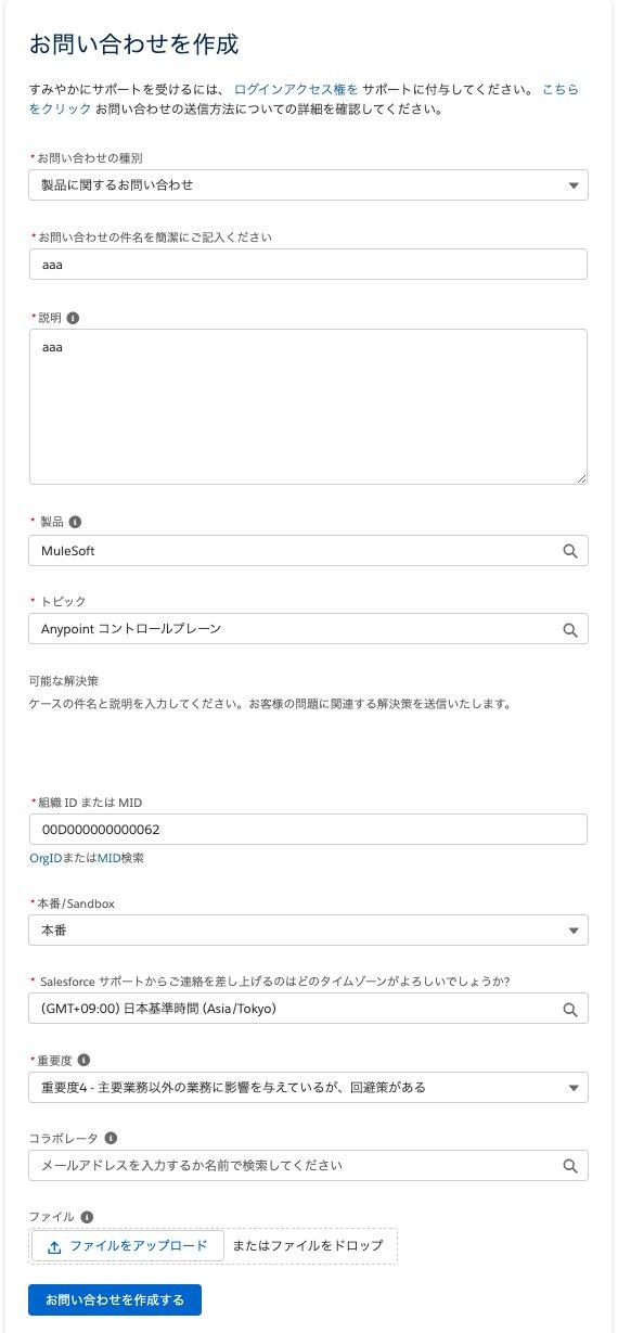 この後、Salesforce ヘルプにログインし、MuleSoft の問題に関するテクニカル サポート ケースを送信できます。MuleSoft のEmailアドレスを使用してログインすることを忘れないでください。
