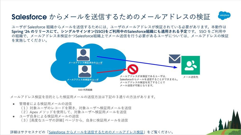 メールアドレス検証に関する情報についてです。メールアドレスが未検証であるユーザはSalesforceからメールを送信することができず、Spring’24ではこの動作がシングルサインオンを利用している組織にも適用されます。本リリースノートではDKIMで検証されたドメインに属するメールアドレスは検証済みとみなされる旨が記載されました。
