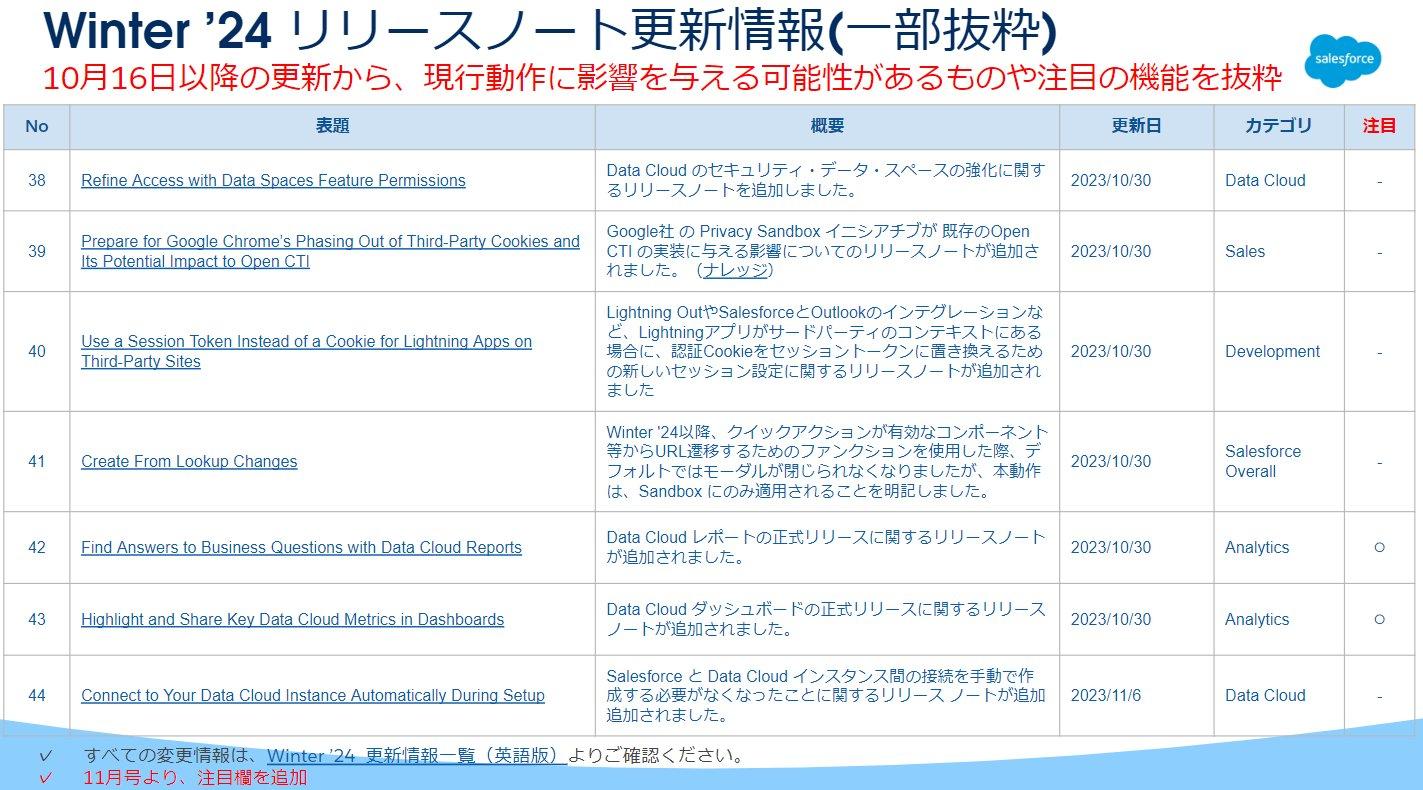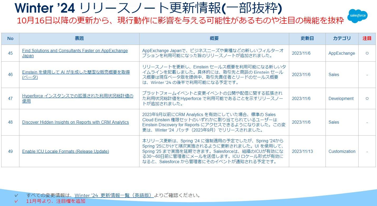 まずは、Winter '24リリースノートの更新情報です。