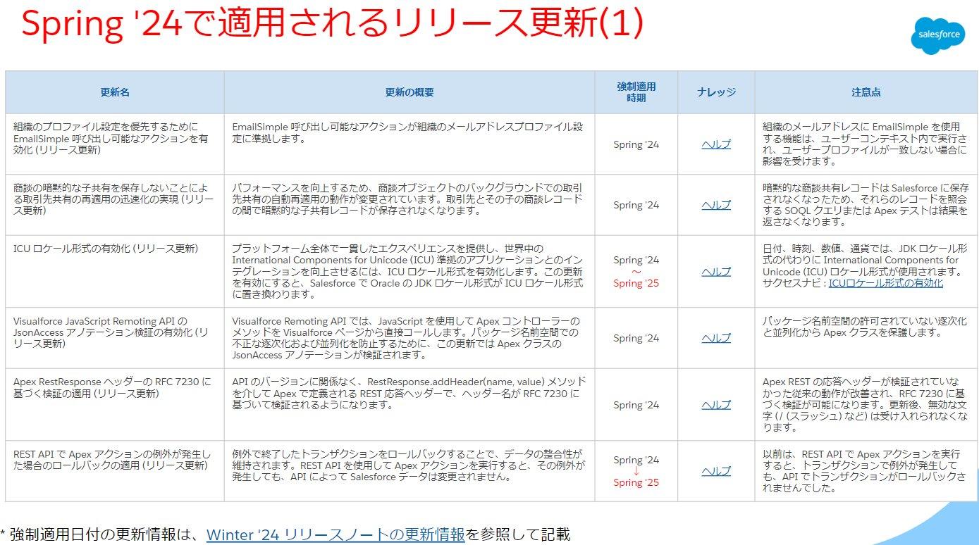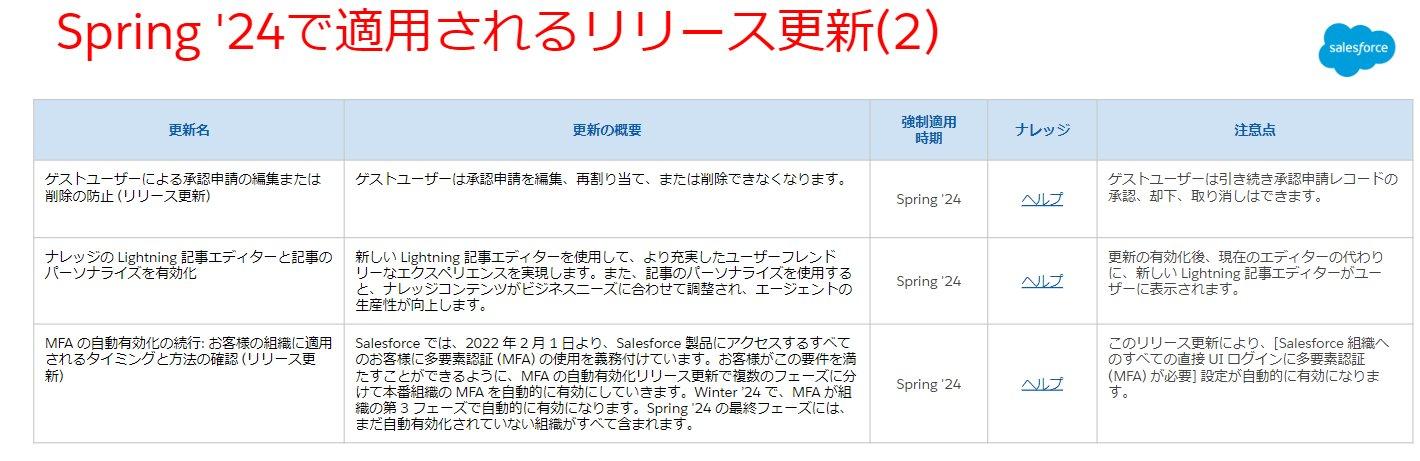 こちらのリリース更新は特に変更ございません。それぞれのリリース更新の詳細説明については割愛させていただきますが、Spring'24でも複数のリリース更新が適用されるため、公開情報をご確認の上、適用に向けたご準備をお願い致します。