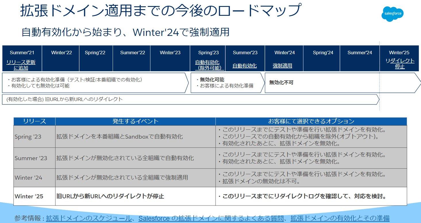 拡張ドメイン適用までの今後のロードマップについては、変更はございません。旧URLにアクセスした際のリダイレクトがWinter'25で停止となる旨を通知する製品コミュニケーションメールが12月4日に管理者様に送信されます。詳細は製品コミュニケーションメールの内容をご確認ください。
