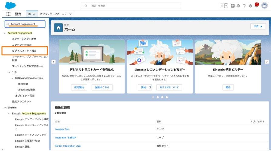 1. Salesforce設定のホームから[Account Engagement]セクション >[ビジネスユニット設定]をクリック