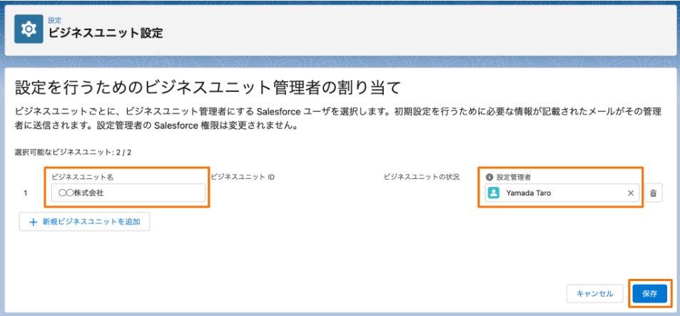 2. [ビジネスユニット設定]の画面で「ビジネスユニット名」「設定管理者」を設定し、[保存]をクリック