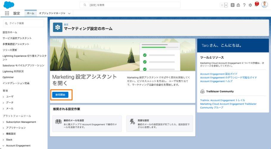 3.有効化後に遷移する[マーケティング設定のホーム]画面で[使用開始]をクリック