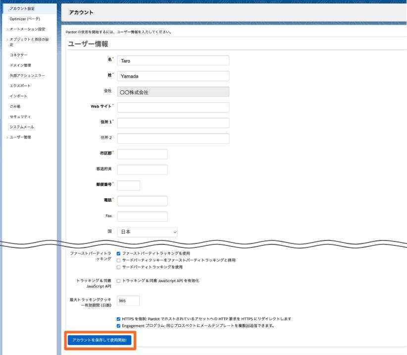 - Account Engagement Lightningアプリケーションを有効化したら、管理者自身がAccount Engagementにログインし、アカウントの情報を入力します。