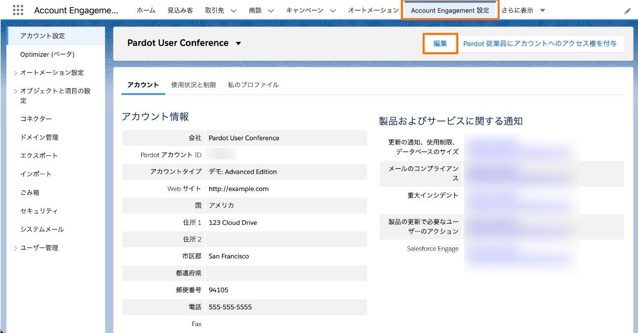 上部のメニューで[Account Engagement設定]>[編集]をクリック