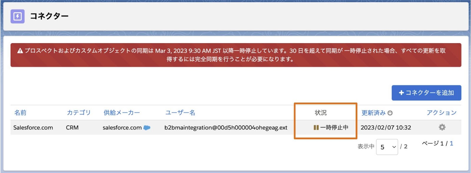 2.[Salesforce.com]コネクターの状況が[一時停止中]になっていることを確認